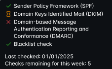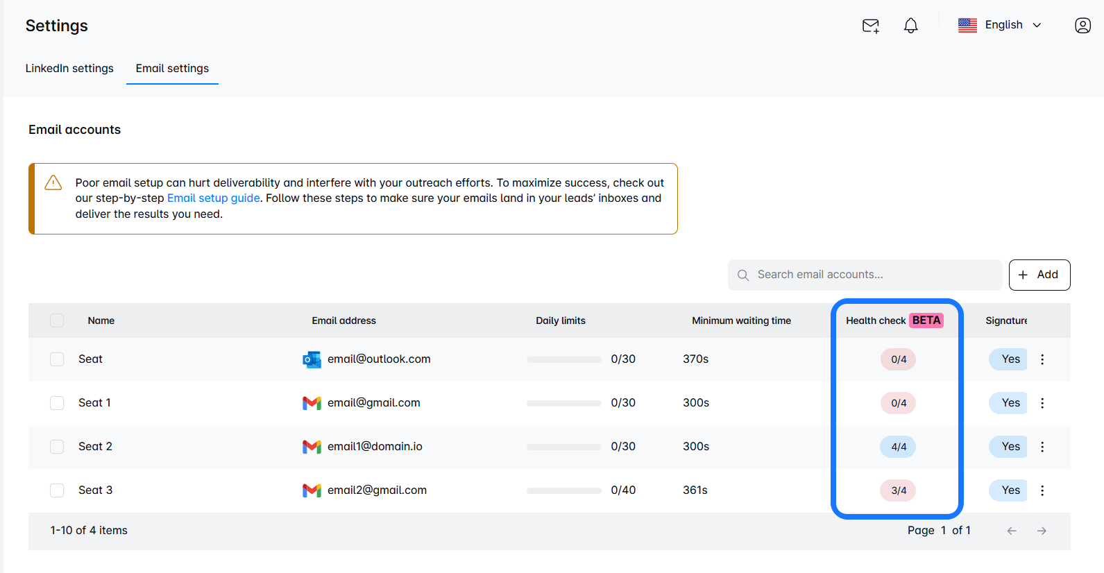 It shows a simple score like 4/4 when everything is healthy. If something’s off, you’ll see exactly how many checks passed and which ones need attention (3/4, 2/4, 1/4). If any required records fail, that email won’t be usable for campaigns until it’s fixed.