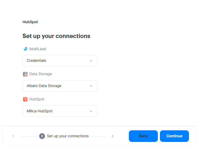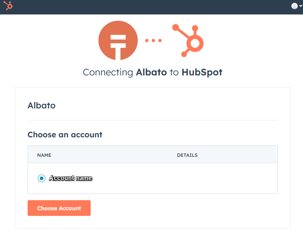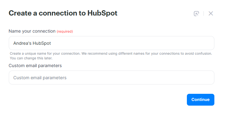 Give your integration a name (helpful if you manage multiple connections), then click Continue to choose your HubSpot account.