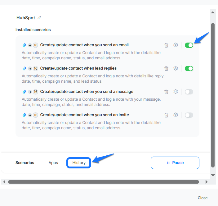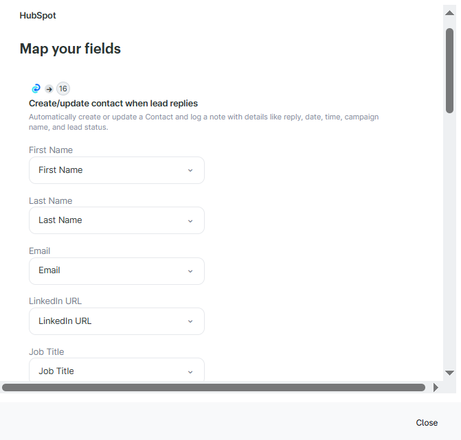 Logs your sent email as a note in HubSpot with campaign details, timestamp, and contact information.Create/update contact when you send a LinkedIn message